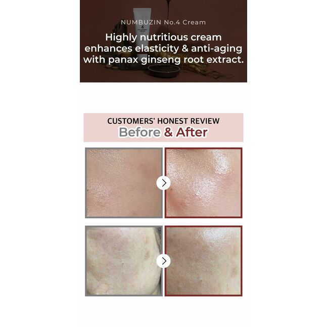 Numbuzin брэндийн No.4 Full-Nutrient Firming Cream нь арьсыг тэжээлээр хангаж, уян хатан чанарыг нэмэгдүүлэн, үрчлээг багасгах үйлчилгээтэй өндөр концентрацитай тэжээлийн тос юм. Энэхүү тос нь 6 жилийн настай улаан хүн орхоодойн хандыг агуулсан бөгөөд арьсыг сэргээж, залуужуулахад тусалдаг.