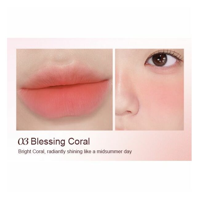 “Blessing Coral” нь намуухан корал туяатай, зөөлөн матте-блёр эффекттэй tint balm. Уруулд хөнгөн мэдрэмжтэй, жигд ууссан мэт харагдуулдаг тул өдөр тутмын хэрэглээнд тохиромжтой.